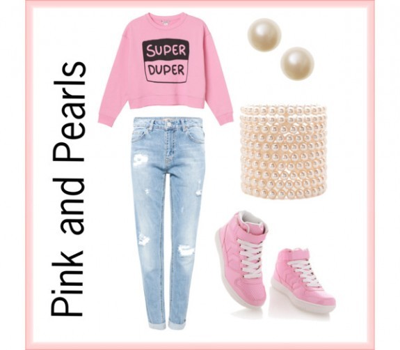 Here is a really girly look. Wear pink and add a few pearl accessories that will take your look to the next level. Add a little edge to your girly pink by adding a graphic sweatshirt midriff, a pair of ripped jeans and pink high-tops. Finish the look off with a multi-stacked pearl bracelet and delicate pearl earrings. Cute and edgy is a look that can never be boring.