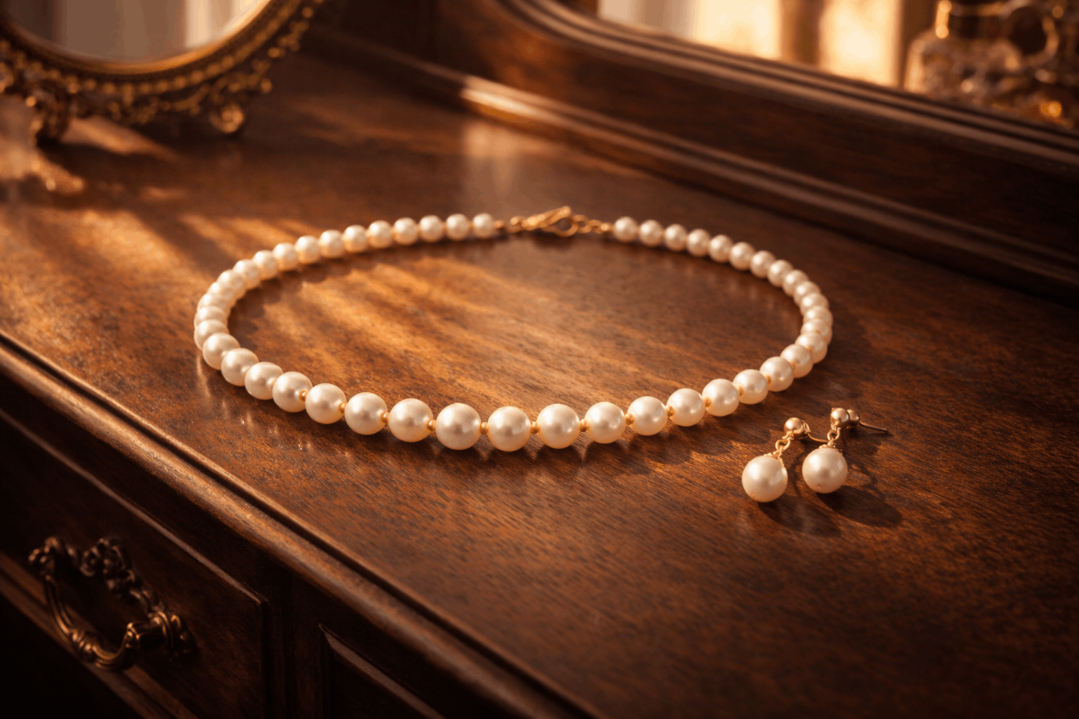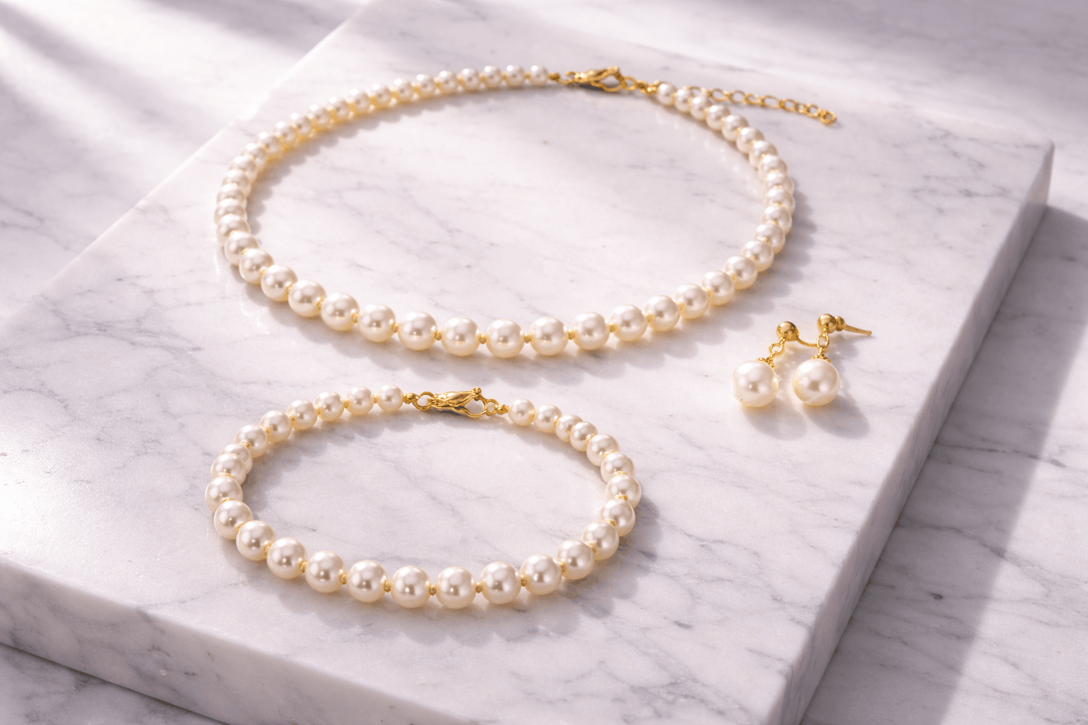 بالإضافة إلى عامل التناسق الذي لا يقدر بثمن حقًا. لمعان اللؤلؤ متطابق عبر جميع القطع. تشطيبات المعادن متطابقة. نسب الأحجام منطقية معًا. لا ترتدين قلادة بيانية كبيرة مع أقراط صغيرة جدًا أو سوار رقيق مع لؤلؤ درامي جريء في مكان آخر. كل شيء يبدو مقصودًا ومتناسقًا دون أن تضطري للتوتر بشأنه.