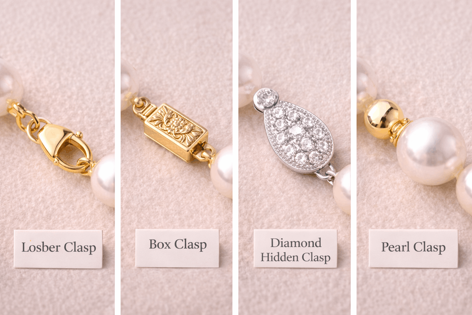 إغلاقات اللؤلؤ نفسها تضيف أناقة. بعض العقود تتميز بكرات لؤلؤ مزخرفة كإغلاق. تبدو مقصودة وجميلة حتى لو كانت مرئية. بالإضافة إلى أن إغلاقات اللؤلؤ تناسب أسلوب العروس تماماً. ومع ذلك تأكدي أن لؤلؤ الإغلاق يطابق لؤلؤ السلسلة في الحجم واللون. إغلاق غير متطابق يبدو غير مكتمل بدلاً من أنيق.